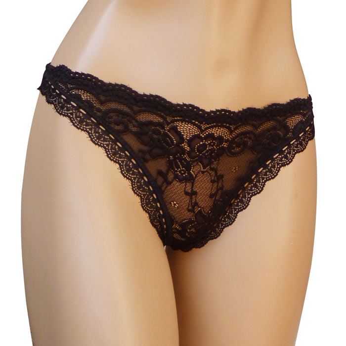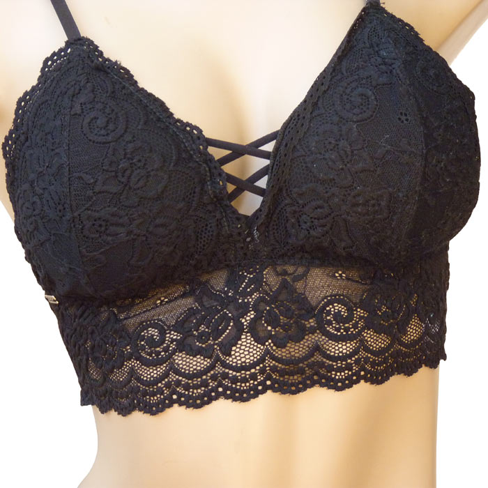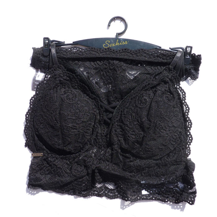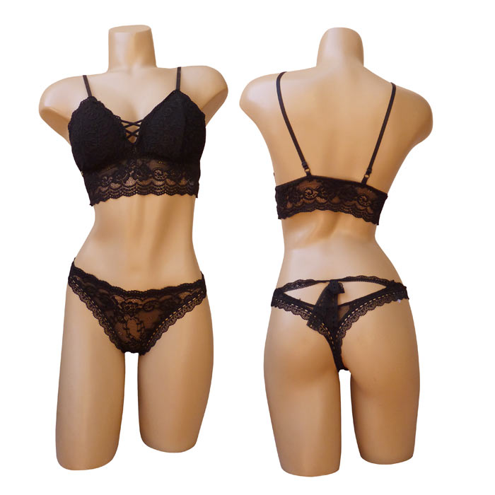 Ensemble soutien gorge avec tanga Soutien-gorge bralette triangle sans armatures livré avec mousses amovibles. Bralette en dentelle magnifiée par un laçage à l'entre-bonnet. Large Bande de dentelle broderie fleurs sous poitrine, environ 7 cm. s’enfile comme un tee-shirt, bretelles réglables et non amovibles. Tanga, en dentelle, attache sur le derrière avec ouverture sur le haut des fesses. Livré sur cintre. 1 taille : L/XL: .
